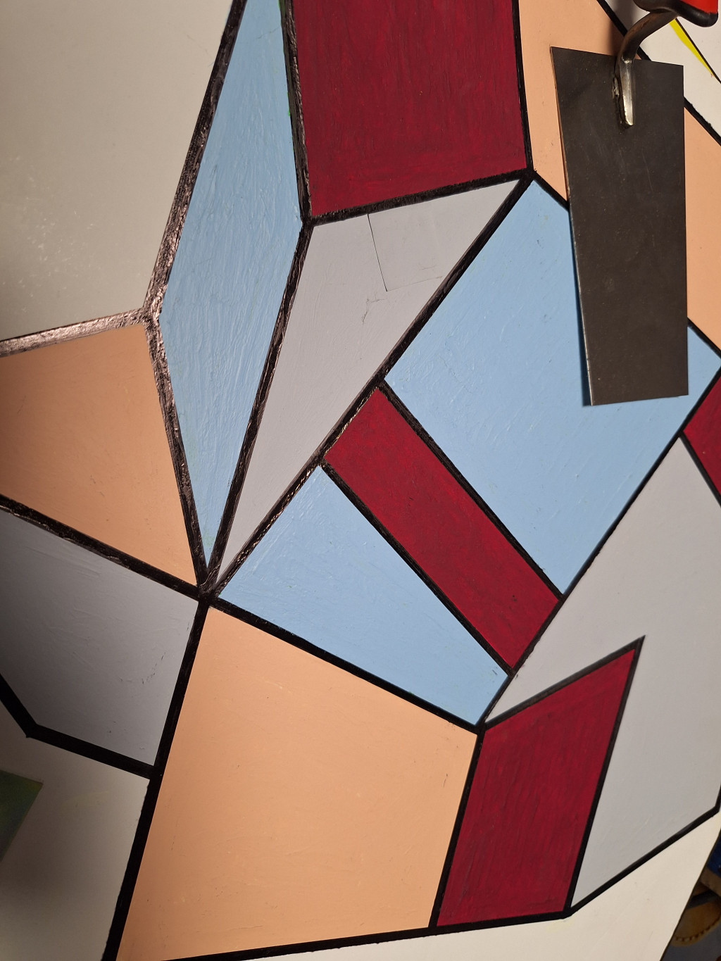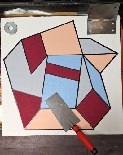 Galla Miklós saját absztrakt alkotása : "Zsanér Zsáner" aláírt 49 x 49 cm. Kemény habkartonon, akril és vegyes technika. A zsanér és vakoló kanál ragasztva vannak.