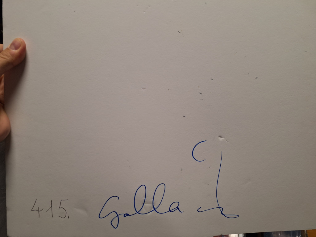 Hátoldalon aláírva, számozva. (A számozás azt jelenti, ahogy a művész úr sorrendben készítette a képeit. Az elsőn 1-es szám szerepel, a háromszázadikon 300. Egyfajta leltári szám.)