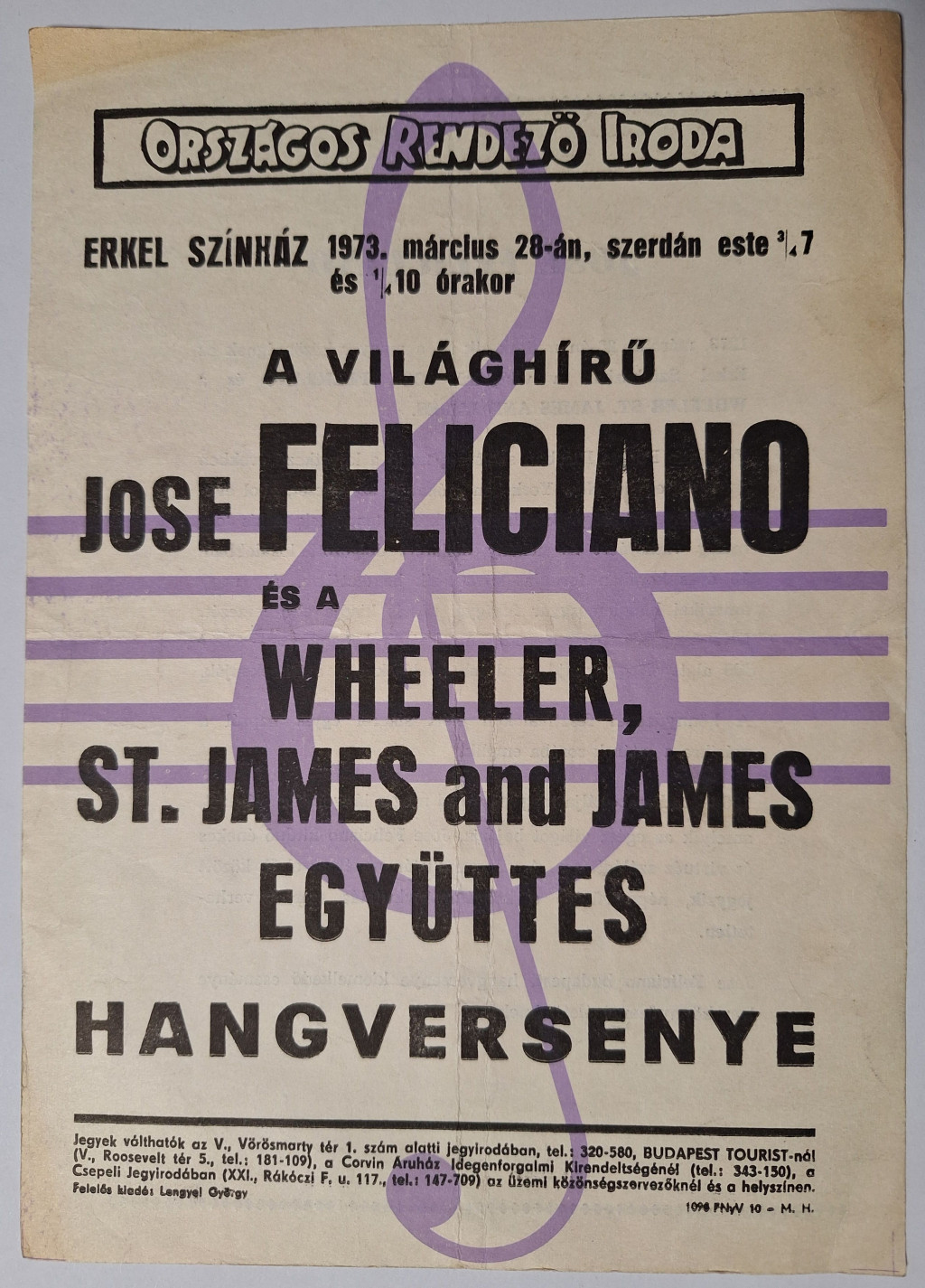 ORI. Erkel Színház Jose Feliciano és Wheeler,St. James együttes hangversenye kisplakát 1973