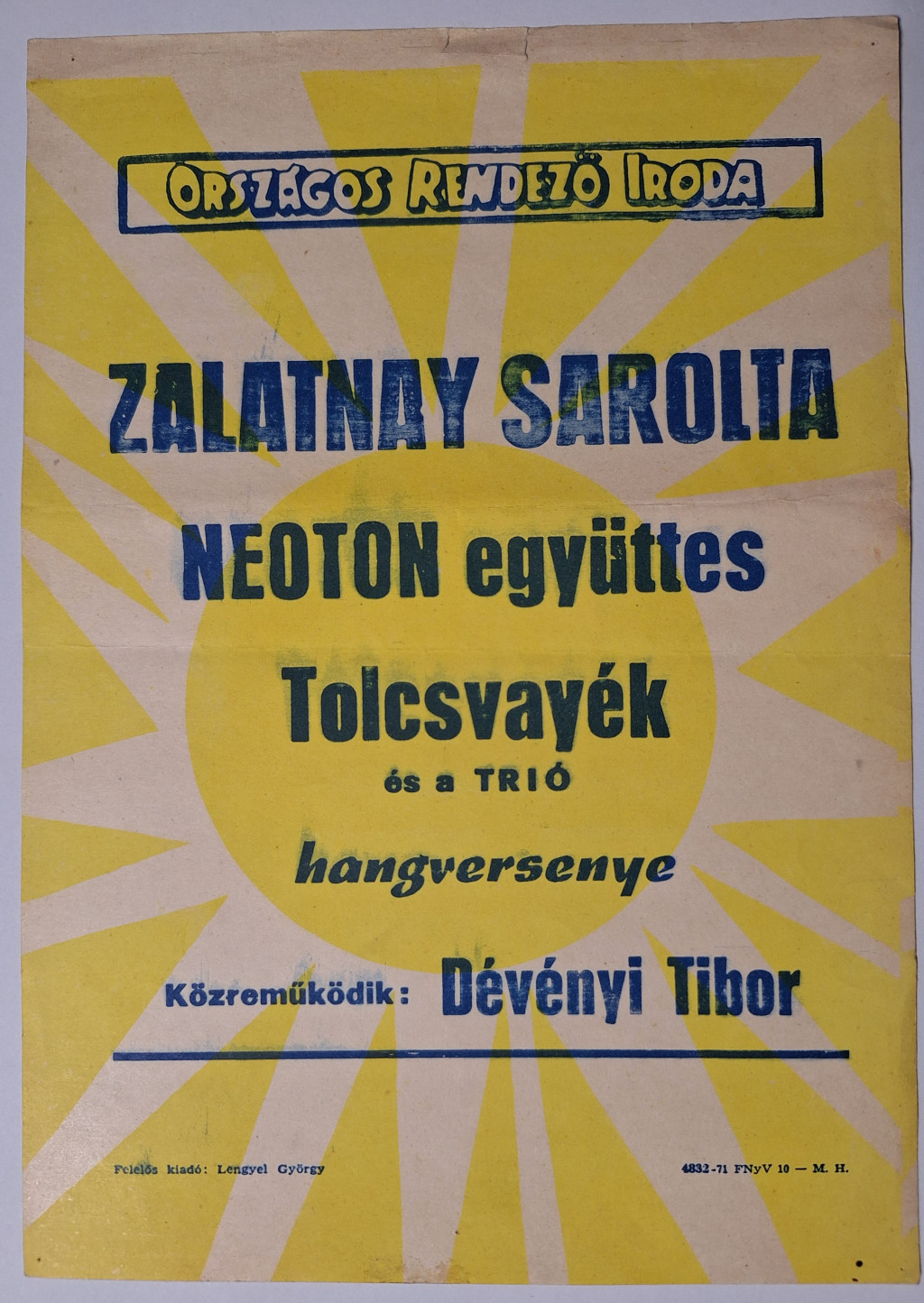 ORI. Villamosplakát (1971) Zalatnay Sarolta, Neoton, Tolcsvayék, Dévényi Tibor). Hátoldalon ceruzás írás. Felül kis beszakadások.